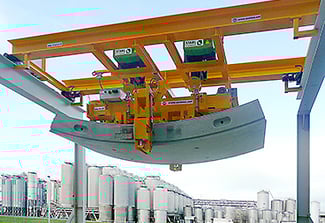 Für Tunnelbauten werden starke und zuverlässige Maschinen benötigt, die den Ausbau der Röhren sicher gewährleisten. ACIMEX produziert hierfür Segmentwägen und Segmentaufrichter, die auf der Tunnelbaustelle mit den einzelnen Schalungselementen operieren: Der Segmentwagen, ausgestattet mit einem Vakuumheber, greift und hebt die Schalungselemente vom Tunnelservicezug und befördert sie weiter ins Tunnelinnere. Hier werden sie von Segmentaufrichtern mithilfe eines Luftvakuums aufgenommen und an ihre endgültige Position gebracht. Ausgestattet mit zwei seitlichen Gummisaugern, die unter dem Fahrgestell befestigt sind, und einer zentralen Vakuumpumpe kann der ACIMEX-Segmentaufrichter Elemente in X-, Y- und Z-Richtung um bis zu 360° drehen. Bis zu 20 Tonnen schwere Teile werden so in die maximal höchst mögliche Position gehoben und mit einer Genauigkeit von ± 5° platziert. Die Hebetechnik, die diese Arbeit vollbringt, stammt oft von STAHL CraneSystems.