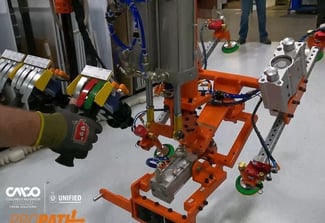 In automobile manufacturing, time is money. Every minute saved in the process can move another vehicle off the line and into the market. To increase efficiency and reduce process time, a high production automobile manufacturer needed to reduce the takt time for the engine and transmission marriage process. Specifically, the manufacturer was using a manual marriage cell where several processes had to be performed by a single operator. This included picking hardware, selecting traverse time, marrying two heavy components (an engine and a transmission), and installing a wiring harness and attachment hardware.