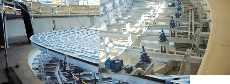 Around 60 to 70 SHE screw jacks are used in each curve for axial adjustment of the curve segments. The screw jacks offer a maximum lifting force of 50 kN and are equipped with self-locking trapezoidal threaded spindles. The even curve-rise and the curve-arc require different stroke lengths, transmission ratios and screw pitches on the SHE (Tr 47 x 7 to Tr 45 x 3.51). The reason for this is that all screw jacks must reach their respective end positions at the same time, i.e. within 50 seconds, despite different stroke lengths. For each curve, 14 three-phase standard motors with 4.5 kW drive power drive the worm gear screw jacks via the corresponding bevel gearboxes K11.13 and cardan shafts. These are mechanically coupled to each other by means of additional cardan shafts, so that an absolutely synchronized drive train is available in every curve.