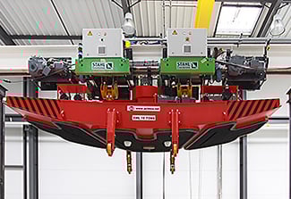 How does the technology work? Fitted with two lateral rubber suction cups fastened underneath the chassis and a central vacuum pump, the ACIMEX segment erector can turn the elements up to 360 degrees in the X, Y and Z direction. Parts weighing up to 20 tons are lifted in this way to the highest possible position and placed with a precision of ± 5 degrees. STAHL CraneSystems regularly provides the hoisting technology that performs this work.