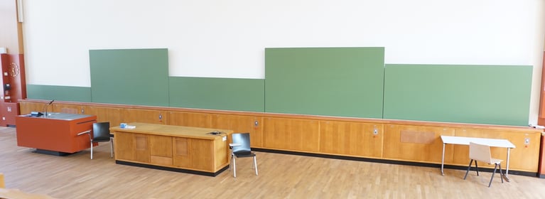 Avec ses 481 places, l'amphithéâtre Heinz-Schönfeld est l'un des plus grands de l’Université technique de Dresde. Il fait partie des bâtiments exceptionnels construits à Dresde au début des années 1960 et il est classé monument historique. En plus du style typique de l'époque, l’amphithéâtre se distingue par son excellente acoustique, qui lui a valu dès le départ une réputation nationale auprès des professionnels. Cependant, l’amphithéâtre avait fait son temps et avait besoin d’une rénovation complète, de même que son équipement technique, qui était obsolète et usé. Le grand chantier de rénovation s’est également attaqué au système de tableaux muraux. Toute la technologie d'entraînement, y compris les câbles et les rouleaux, était très usée. L'objectif était de remplacer l'ancien système de tableaux par une meilleure solution technique.